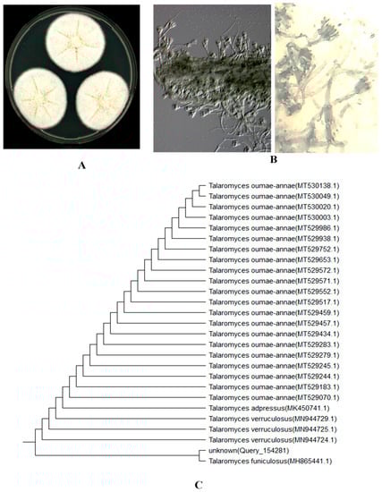 Morphological (A,B) and molecular identification (C) of T. funiculosus strain CBS 129594.