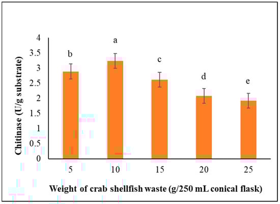 The weight of crab shellfish waste has an effect on the production of chitinase. Different weights of crab shellfish waste (5, 10, 15, 20, and 25 g/250 mL conical flask) were used to evaluate the production of chitinase. The results showed that 10 g/250 mL conical flask gave the highest production of chitinase (3.24 ± 0.2 U/g). The production of chitinase decreased significantly with an increase in the weight of crab shellfish waste (Figure 2).