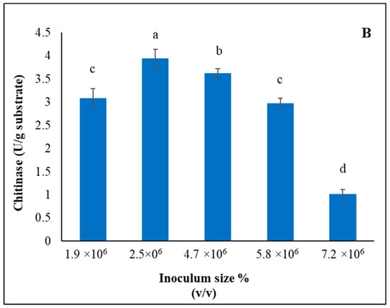Effect of the incubation period (A) and inoculum size (B) on the production of chitinase on SSF by T. funiculosus strain CBS 129594. The values are the means of three replicates with standard deviation (±SD). Mean values in each bar followed by a different lower-case letter are significantly different according to Duncan’s multiple range tests at p ≤ 0.05.