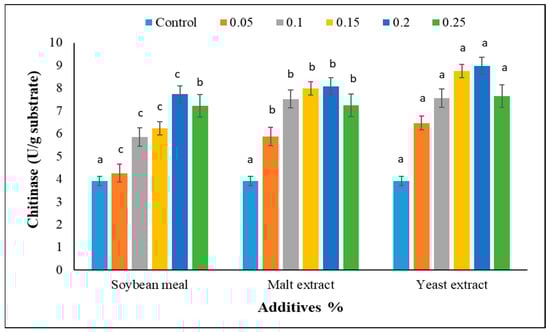 Effect of additives concentrations on the production of chitinase on SSF by T. funiculosus strain CBS 129594. The values are the means of three replicates with standard deviation (±SD). Mean values in each bar followed by a different lower-case letter are significantly different according to Duncan’s multiple range tests at p ≤ 0.05.