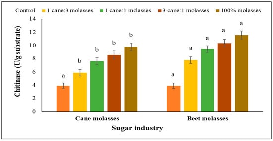 Effect of sugar industry concentration on the production of chitinase on SSF by T. funiculosus strain CBS 129594. The values are the means of three replicates with standard deviation (±SD). Mean values in each bar followed by a different lower-case letter are significantly different according to Duncan’s multiple range tests at p ≤ 0.05.