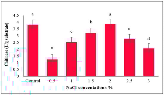 Effect of NaCl concentrations on the production of chitinase on SSF by T. funiculosus strain CBS 129594. The values are the means of three replicates with standard deviation (±SD). Mean values in each bar followed by a different lower-case-letter are significantly different according to Duncan’s multiple range tests at p ≤ 0.05.