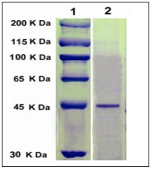 The results demonstrated that SDS-PAGE electrophoresis of pure chitinase revealed the existence of a specific protein band that has a molecular weight of 45 kDa (Figure 7).