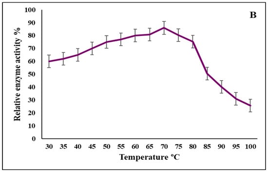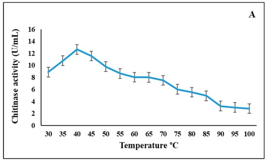 One of the important conditions for the efficacy of enzyme activities is reaction temperature. The optimum temperature for chitinase activity was observed to be 40 °C (12.36 ± 0.5 U/mL). As a result, the activity of chitinase decreased progressively as the temperature rose or fell above 40 °C (Figure 9A). At 70 °C, the relative stability of chitinase activity was 85.9% (Figure 9B).
