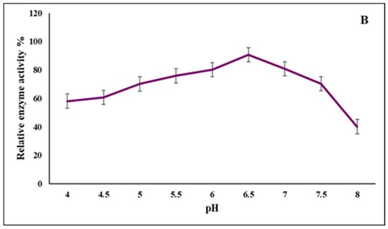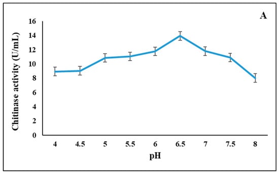 T. funiculosus-purified chitinase had the highest activity at 40 °C (12.36 ± 0.5 U/mL), with a relative activity of 85.9% at 70 °C. The decline in chitinase activity at this temperature could be due to peptide chain hydrolysis, inaccurate confirmation, aggregation, or degradation of amino acids []. Our findings are completely consistent with the optimal temperature range for most fungal chitinase, which is 25 to 50 °C [,]. The type of the amino acids found in the active site determines pH dependent enzyme activity []. The results showed that pure chitinase was ideally active at pH 6.5, with an activity of 13.93 ± 0.9 U/mL and a relative activity of 90.6%. This optimum pH is the same as that recorded for purified chitinase from Thermomyces lanuginosus [].