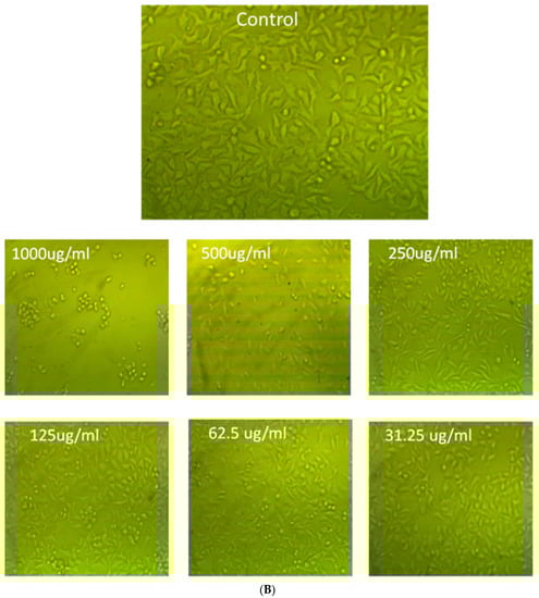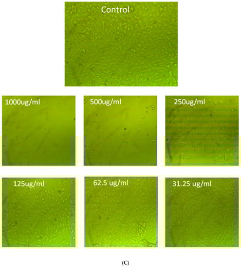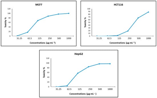 Three different cell lines (colorectal carcinoma colon cancer (HCT116), breast cancer of the mammary gland (MCF7), and hepatocellular cancer (HepG2)) were used in this study. The cell lines were obtained and activated according to the ethics of the scientific community by VACSERA-Cell Culture Unit, Cairo, Egypt. (1) To create a full monolayer sheet, 1 × 105 cells/mL (100 L/well) of cells were added to the 96-well tissue culture plate. The plate was then incubated at 37 °C for 24 h. (2) After the cell monolayer had been washed twice with wash media, the growth medium was decanted from the 96-well microtiter plates. (3) The tested material was diluted twice in RPMI medium with 2% serum (maintenance medium). (4) Three wells served as the control wells and received only maintenance medium while 0.1 mL of each dilution was examined in different wells. (5) The 37 °C-incubated plate was inspected. The physical characteristics of toxicity, such as partial or total loss of the monolayer, rounding, shrinkage, or cell granulation, were examined in the cells. (6) A MTT solution (5 mg/mL in PBS) (BIO BASIC CANADA INC, Markham, Canada) was made and each well received 20 µL of the MTT solution. For five minutes, shake at 150 rpm to properly blend the MTT into the media and allow the MTT to metabolize for 1 to 5 h in an incubator (37 °C, 5% CO2). (7) Dump off the media (dry the plate on paper towels to remove residue if necessary) and resolve 200 µL of formazan (a metabolic product of MTT) in DMSO. To thoroughly combine the formazan and solvent, place on a shaking table and shake at 150 rpm for 5 min. Read the optical density at 560 nm and subtract the background at 620 nm as described by Mosmann [] and Wilson []. The relative cell viability (RCV) in percentage was determined according to the following equation: