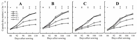 Figure 2. Changes in capsule dry matter for two flax cultivars at five P levels in two growing seasons. (A) Lonyaza 1 in 2018; (B) Longya 14 in 2018; (C) Lonyaza 1 in 2019 and (D) Longya 14 in 2019, respectively. The vertical bars indicate the least significant differences (LSDs) with p ≤ 0.05 among five P levels (n = 3).