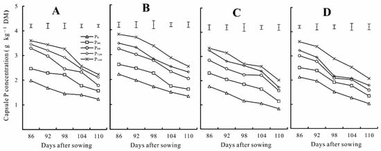 Figure 3. Changes in phosphorus concentration of the capsule for two flax cultivars at five P levels in two growing seasons. (A) Lonyaza 1 in 2018; (B) Longya 14 in 2018; (C) Lonyaza 1 in 2019 and (D) Longya 14 in 2019, respectively. The vertical bars indicate the least significant differences (LSDs) with p ≤ 0.05 among five P levels (n = 3).