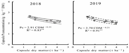 Figure 5. Critical phosphorus (Pc) data points for the capsule Pc curve definition using pooled data from two years. The solid line represents the critical P dilution curve (Pc = 2.84 CDM−0.22, R2 = 0.82 **), which describes the relationship between the critical P concentration and the capsule dry matter of flax in northwest China. The dotted lines represent the confidence intervals (p = 0.95). ** Significance at p < 0.01 probability level.