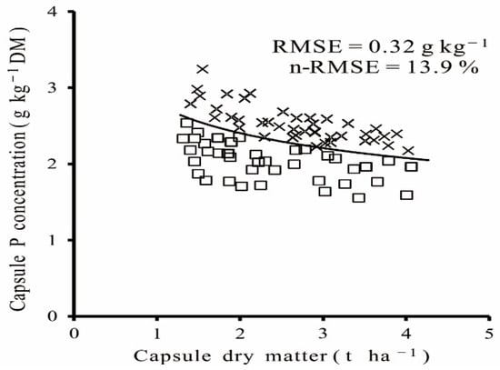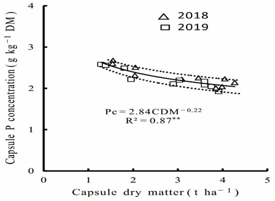 Parameter b describes the decline in CPC with crop growth and therefore depends on capsule P uptake relative to the CDM increase. The decline in CPC during reproductive growth can be attributed to the decrease in P concentration per unit CDM, similar to the N concentration decline per unit shoot DM in linseed [30]. The decrease in CDC is probably due to (i) a large photosynthetic product of other vegetative parts (stem and leaf) transferred to the seed for yield formation during the reproductive growth period [4,31], which causes the faster rate of CDM accumulation, and (ii) the P nutrition of pericarp and stalk was transferred to the seed for fatty acids and other nutrients formation, which results in a declining P concentration of pericarp and stalk during the reproductive growth period.