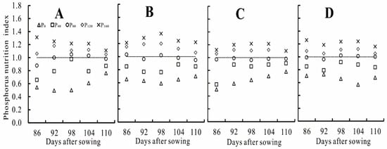Figure 7. Phosphorus nutrition index (PNI) of two flax cultivars with five P rates in two years. (A) Lonyaza 1 in 2018; (B) Longya 14 in 2018; (C) Lonyaza 1 in 2019 and (D) Longya 14 in 2019, respectively. The reference line at PNI = 1 represents optimal P nutrition, while PNI > 1 shows excess P fertilizer application, and PNI < 1 shows P deficiency.