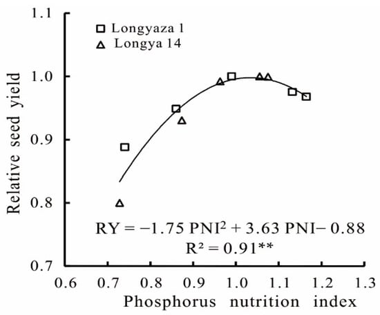 The relative seed yield (RY) was obtained by dividing the seed yield at a given P rate by the highest seed yield among all P treatments [13,17]. The RY was calculated as the following equation: