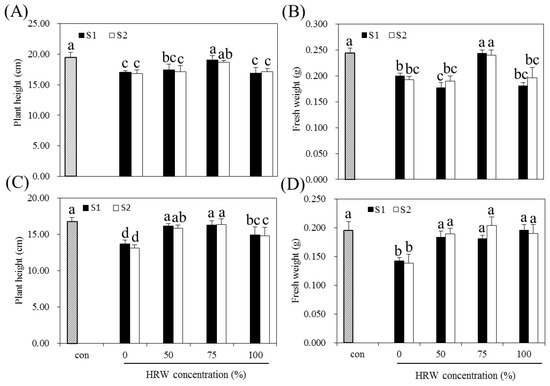 The effects of different concentrations of HRW (hydrogen-rich water) on rice plant height (left) and fresh weight (right) of indica (A,B) and japonica rice seedlings (C,D). S1 and S2 denote BS concentrations of 30 and 45 g a.i./hm2, respectively. Bars are the mean ± SE from three independent experiments. Different lowercase letters indicate significant differences at p < 0.05 according to Duncan’s multiple-range test.