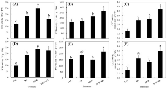 Effects of the HRW (hydrogen-rich water) pretreatment on SOD (superoxide dismutase) (A,D), POD (peroxidase) (B,E), and CAT (catalase) (C,F) activity in the leaves of two rice cultivars under BS (Bispyribac-sodium) stress. HRW and BS indicate treatment with HRW (hydrogen-rich water) and BS (Bispyribac-sodium) alone, respectively; HRW + BS indicates the co-treatment with HRW and BS. The leaves were pretreated with 75% saturation of HRW for 24 h, followed by the application of BS at 30 g a.i./hm2. Each enzyme’s activity in indica rice seedlings (A–C) and japonica rice seedlings (D–F) was determined after five days. Bars are the mean ± SE from three independent experiments. Bars with different letters are significantly different at p < 0.05 according to Duncan’s multiple-range test.