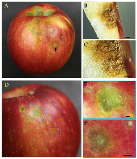 Green spot symptoms on ‘WA 38’ fruit. Example of: (A) ‘WA 38’ apple with “severe” GS symptoms visible on the surface and in the underlying parenchyma; (B) at 1× and (C) 2× magnification (black arrow indicates the position of cut for magnified images); (B,C) note the darkened, cork-like tissue and areas of collapsed cells; (D) green spots centered around lenticels in two different locations on a ‘WA 38’ apple were visualized under (E) 1× and (F) 2× magnification. Whole fruit images (A,D) were taken with a Canon EOS 70D DSLR camera, and magnified images were taken with a Nikon SM18 stereomicroscope. Scale bars represent 1 mm at each respective magnification.