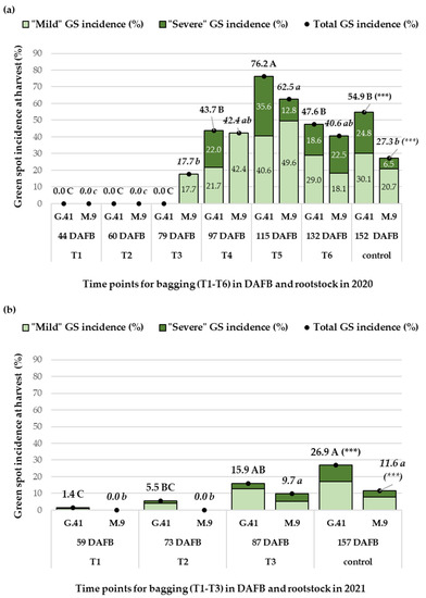 Green spot incidence at harvest by bagging time point and rootstock in (a) 2020; and (b) 2021. To facilitate the comparison between time points in the two seasons they are expressed in DAFB (for 2020: T1 = 44 DABF to T6 = 132 DAFB and for 2021: T1 = 59 DAFB and T3 = 87 DAFB). Light green shaded bars represent the proportion of “mild” GS, and dark green shaded bars represent the proportion of “severe” GS over the total incidence. Total incidence (%) in each treatment combination is cited above each bar and indicated by a round black marker. Separation of means are indicated by capital (‘G.41’) or lowercase italics (‘M.9’) letters within each rootstock and year, and the significance within each rootstock across time points (*** = p ≤ 0.001) is indicated in parentheses on the right side of the figure.