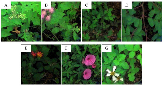 Partial samples of seven invasive plants and the calibration plate. (A) Mikania micrantha Kunth, (B) Sphagneticola calendulacea (L.) Pruski, (C) Ageratum conyzoides L., (D) Mimosa pudica Linn., (E) Lantana camara L., (F) Ipomoea cairica (L.) Sweet, (G) Bidens pilosa L.
