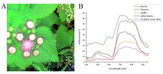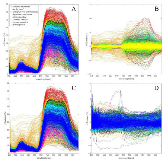 Then, the spectrometer’s lens was aimed directly at the surface of the invasive plant and manually focused to the middle of the leaves. Eighty images of vegetation were collected using the hyperspectral camera and were used in this study. Partial samples of seven invasive plants are shown in Figure 1. The images contain leaves, flowers, stalks, other plants and the no-plant cover area. Among them, flowers, stalks and the no-plant cover area belong to background. The leaves and background feature points were extracted manually from the original images using Cubeware software (approximately 43 per image, 38 of which are leaves feature points), as shown in Figure 2A; the spectral curves are shown in Figure 2B and saved in ASCII format. In this work, 3359 raw spectral data samples (M. micrantha: 428, background: 409, S. calendulacea: 428, A. conyzoides: 425, M. pudica: 419, L. camara: 408, L. cairica: 418, B. pilosa: 424) were collected, including a random partition a training set (2400 samples, each category has 300 samples) and testing set (959 samples).