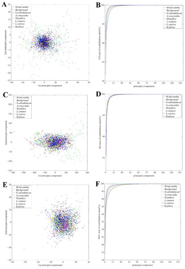 Based on the preprocessing results, dimension reduction analysis was conducted by PCA, as shown in Figure 4A,C,E, which are the point states drawn in horizontal (first principal component scores) and vertical (second principal component scores) coordinates. In this way, we can preliminarily judge the convergence degree of FD, SG smoothing and SNV. According to Figure 4A,C,E, it is obvious that FD-PCA has a better sample clustering effect, but S. calendulacea, L. camara and B. pilosa overlap clearly. In Figure 4C, the seven invasive plants are relatively scattered; that is, after SG-PCA treatment, the sample points of invasive plants have almost no similar convergence. In terms of clustering performance, FD ranked first, SNV ranked second, and SG ranked third. The worst clustering performance of SG smoothing preprocessing is predictable because SG smoothing reduces noise but does not change details and overall trends. Therefore, more components need to be considered later.
