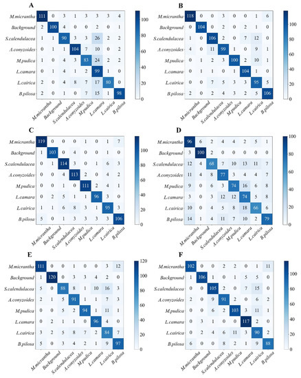 Recent studies have used hyperspectral imaging combined with deep learning methods to monitor invasive plants [50,51]. Meanwhile, deep learning is very popular in species classification [52,53], but it does not mean that the recognition effect of deep learning is superior to that of other algorithms. For example, in the recognition of grapevine species, the recognition effect of a SVM is not inferior to that of a convolutional neural network [54]. However, it cannot be denied that deep learning is a current trend in image recognition. To further improve the accuracy of recognition, it is necessary to adopt a deep learning algorithm.
