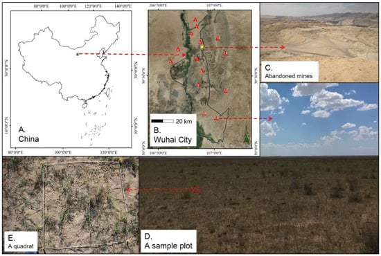Research site and the plot locations of this study. (A): Location of Wuhai City in China; (B): Locations of abandoned mines and sample plots in Wuhai City; (C): Abandoned mines; (D): A sample plot in Wuhai City; (E): A quadrat in a sample plot.