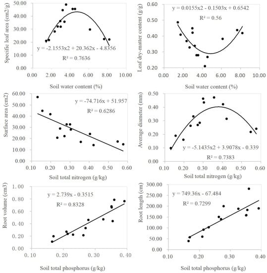 Fitting results of linear model for specific leaf area and soil water content, soil water content and leaf dry matter content, root surface area and soil total nitrogen, root diameter and soil total nitrogen content, average root volume and soil total phosphorus content, and root length and soil total phosphorus content.