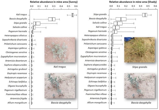 For the shady slope of the restoration area, the relative abundances of the species obtained by the CATS model were as follows: the average relative abundances of Stipa grandis and Bassia dasyphylla should be relatively high, with a median values of 0.46 and 0.13, respectively. This indicated that under these environmental conditions, S. grandis was suitable to be the dominant species in the future repair community, and B. dasyphylla was suitable to be the subdominant species in the future repair community. Therefore, an 8:2 ratio of S. grandis to B. dasyphylla would be the appropriate ratio in the future target community to achieve the target function in the shady slope ecosystem of the mine area (Figure 4). For the sunny slope of the restoration area, the relative abundances of the species obtained by the CATS model were as follows: the average relative abundances of Kali tragus and B. dasyphylla should be higher than all others. This indicated that the typical xerophytic herbs K. tragus and B. dasyphylla in a ratio of 6:4 are suitable for the repair community (Figure 4).