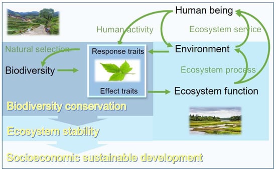 A clear effect of response-effect trait framing on ecosystem can be described as follows: Biodiversity in the community determines the diversity of traits. Effect traits will directly affect human life through specific ecosystem functions, such as food production, or indirectly affect human life through environmental impacts, such as soil and water conservation. Accordingly, response traits can receive direct disturbance from humans, or the indirect influence of humans by changing the environment. Regardless of the direct or indirect disturbance, the biological community will be forced to change, such as the changing of the species composition, to adapt to the environment. Due to response and effect traits both exist in the species, they cannot be divided. This is a loop. So, in order to obtain a positive feedback, we should attach importance to biodiversity conservation at the community scale, ecosystem stability at the ecosystem scale, and sustainable development at the nature–society scale. This is a mutually reinforcing framework (Figure 5).