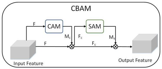 The CBAM module [16] is a convolution-based attention mechanism module. Inspired by SENet [30], CBAM combines both channel attention and spatial attention, as shown in Figure 2. It can be clearly seen that CBAM is composed of CAM and SAM modules, which assign weights to channels and spaces, respectively.