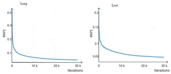 As shown in Figure 6, after 30,000 iterations, the loss functions Lseg and LPAR both decrease rapidly around 1000 epochs, then slow down as the epochs increase, almost leveling off at 30,000 epochs. Among them, Lseg represents the loss of the segmentation result of the query image at the support–query stage, and. LPAR calculates the segmentation loss of support images at the query–support stage, which makes the support prototypes and query image prototypes aligned with each other.