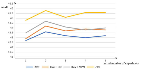 During the test, in order to prevent the error caused by different detections each time, this paper conducts five tests and finally takes the average value. As shown in Figure 7, the model proposed in this paper is higher than the initial network in each test, so the conclusion that our network has a good segmentation ability for plant diseases can be drawn.