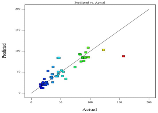 Central Composite Design (CCD) model shows the Graphical representation of Predicted vs. Actual response where different colors are indicated by the value 15.32