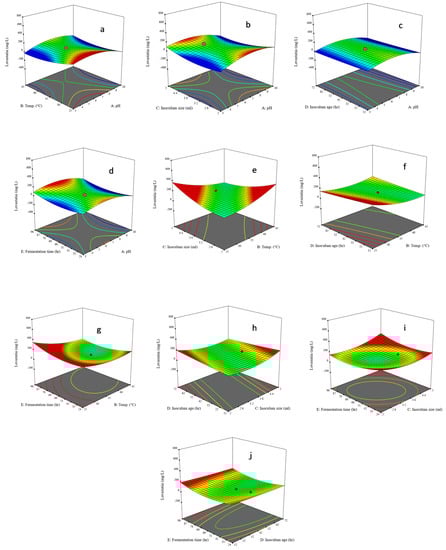 In Figure 2a–j, some interactions are mentioned between different fermentation parameters. The 3D response surface plots indicate the production of lovastatin. These plots are based on the interrelationship between different fermentation parameters. The inter-relationship among parameters AB (pH and temperature), AC (pH and inoculum size), AD (pH and inoculum age), AE (pH and fermentation time), BC (temperature and inoculum size), BD (temperature and inoculum age), BE (temperature and fermentation time), CD (inoculum size and inoculum age), CE (inoculum size and fermentation time) and DE (inoculum age and fermentation time) peaks show the quantity of produced lovastatin is demonstrated in Figure 2a–j, respectively. In these interactions, the effect of any two factors can be studied by keeping the other three factors constant. The production of lovastatin was observed to be maximum at 156.43 mg/L, 122.65 mg/L, 97.24 mg/L, and 156.43 mg/L concerning interactive parameters of AB, AC, AD, and AE, respectively. Similar findings have also been reported by Kumar et al. [], as it is already understood that pH and temperature are critical optimization parameters that are involved in controlling enzyme activity as well as the growth of living organisms. Among all interactions, AB (temperature and pH) and AE (pH and fermentation time) have shown the best combination along with AC (pH and inoculum size) and AD (pH and inoculum age) as shown in Figure 2a–d while BD (temperature and inoculum Age), CE (inoculum size and fermentation time) and DE (inoculum age and fermentation time) have shown better interactions in terms of the maintenance of fermentation parameters while BC (temperature and inoculum size), BE (temperature and fermentation time) and CD (inoculum size and inoculum age) show adverse effects in terms of the maintenance of fermentation parameters for the production of lovastatin. Their negative impact regarding interactions indicates that these interactions have no direct linage on the biosynthetic pathway of lovastatin production.