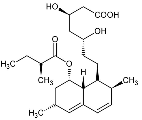 Lovastatin is a drug, which is used to reduce cholesterol in the blood. It is considered the first cholesterol-lowering drug that acts as a competitive inhibitor of the HMG-CoA for enzyme 3-hydroxy-3-methylglutaryl coenzyme A reductase (HMG-CoA) and does not allow the production of mevalonate (an important step for cholesterol production) [,]. In 1987, the Food and Drug Administration (FDA) of the United States of America recommended it as the most effective drug against high cholesterol levels []. It is a whitish crystalline powder, non-hygroscopic in nature, and usually insoluble in water but, it is soluble in acetonitrile, methanol, ethanol, and some other organic solutes and it is also named mevinolin. It is used in the form of free acids as well as in lactone, therapeutically. More technically, lovastatin is soluble in the form of a lactone ring while insoluble in the form of β-hydroxic acid. Invivo and invitro studies suggest that lovastatin plays an inhibitory role on the plasma low-density lipid (LDL) cholesterol level in patients that suffer from dyslipidemia and normal biological production of cholesterol in the body of normal humans and other animals [,]. So, it is an important drug for the treatment of high cholesterol levels in the blood; a condition called hypercholesterolemia, associated with various myocardial infarctions and cardiovascular diseases (CVDs) []. More applications of lovastatin have been observed therapeutically in the inhibition of induced apoptosis, and cellular proliferation, and in various experimental settings, such as necrosis in the case of blood cancers, thus lovastatin also acts as an agent against cancerous cells []. It is also used for the treatment of Alzheimer’s disease, the treatment of coronary heart diseases [], the treatment of certain disorders related to bones, and the low production of TNFs (Tumor necrosis factors) [].