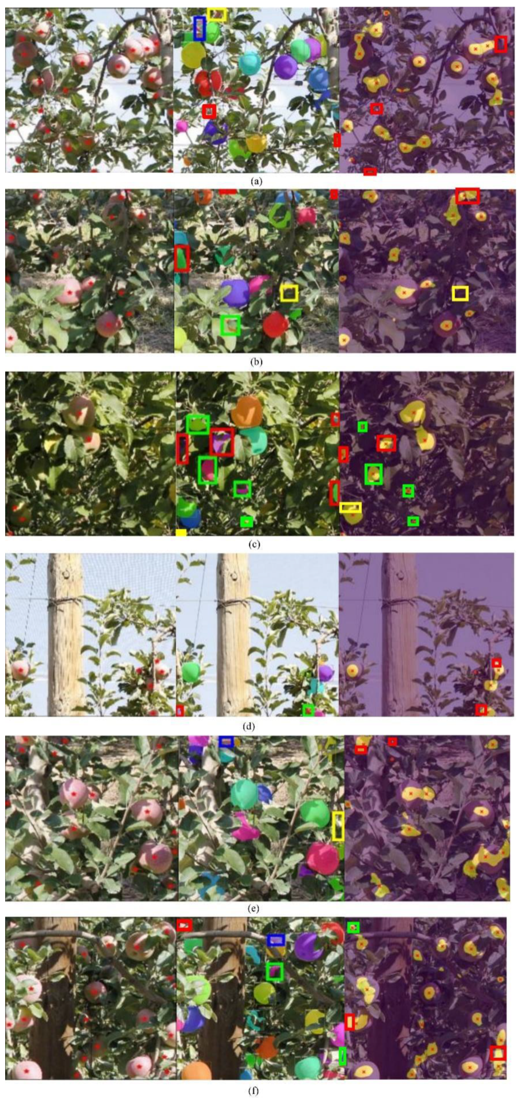 - Apples on the ground: Apples on the ground should not be included in the final yield or regarded as the picking target because they are not fresh. Hence, we provide examples in Figure 4 to show that our method can distinguish fruit on the branches from fruit on the ground. In the training set, apples on the ground were not considered annotation targets. Thus, our method clearly learns this better than Mask-RCNN.