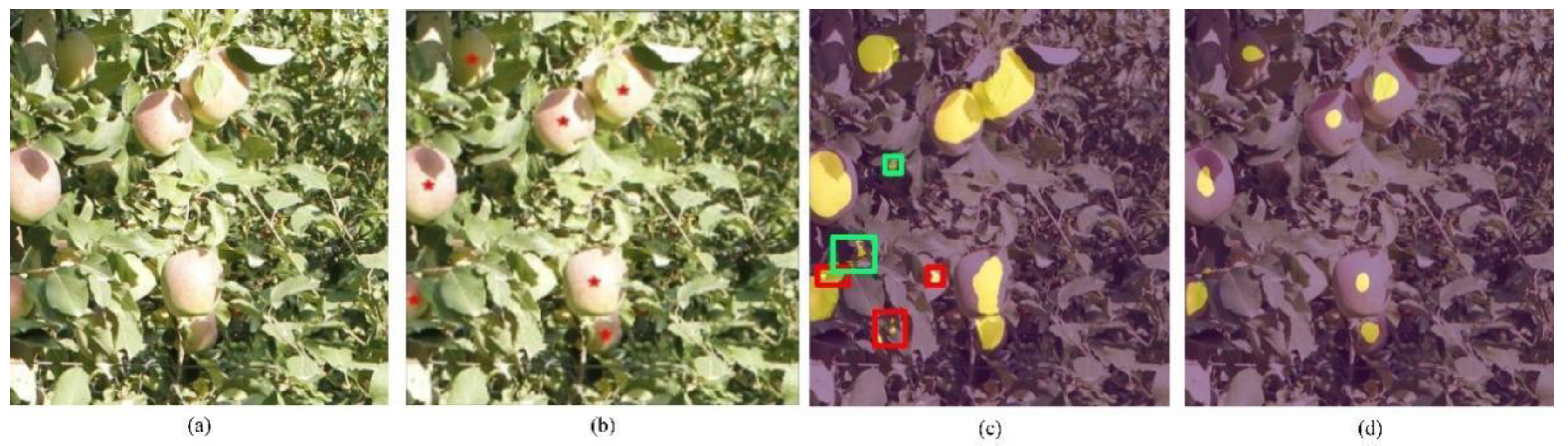 - Nguyen, T.T.; Vandevoorde, K.; Kayacan, E.; Baerdemaeker, J.D.; Saeys, W. Apple detection algorithm for robotic harvesting using a RGB-D camera. In Proceedings of the International Conference of Agricultural Engineering, Pune, India, 21–23 February 2014. [Google Scholar]