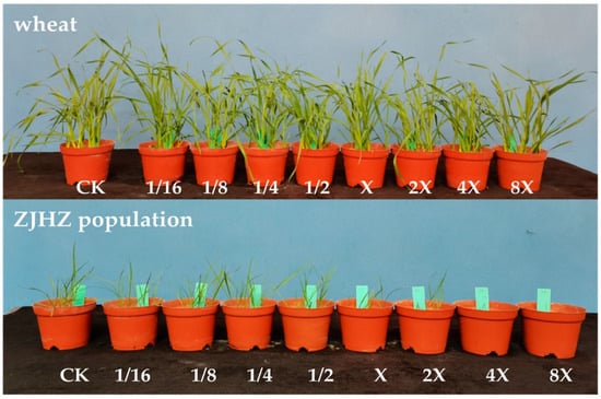 Photographs of wheat (upper) and R. kamoji ZJHZ (lower) 21 days after being treated with different doses of butachlor. The first row shows the untreated control (CK), followed by different doses of butachlor (X represents the recommended field dose 1350 g a.i. ha−1).