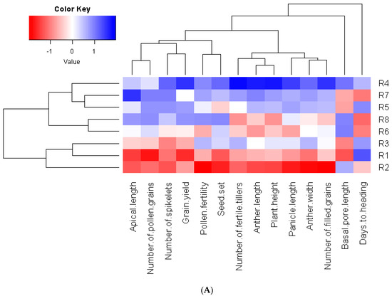 Heatmap and hierarchical clustering divided the evaluated restorer lines (A) and developed hybrid combinations (B) into different clusters based on the evaluated characteristics. Red and blue colors reveal low and high values for the corresponding characteristics, respectively.