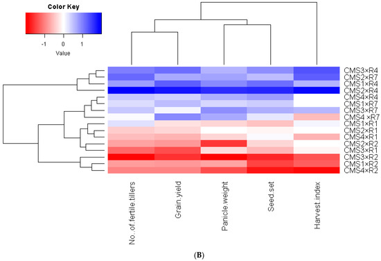 The heatmap is an applicable statistical procedure performed to explore the interrelationship among the assessed genotypes based on the studied characteristics. In the present study, the heatmap and hierarchical clustering based on pollen and agronomic characteristics divided the evaluated six mutant restorer lines and their parental cultivars into different clusters (Figure 1A). The restorer lines R4 and R7 possessed the highest values for most of the pollen and agronomic factors (depicted in blue). On the contrary, the parental cultivars R1 and R2 had the lowest values (depicted in red). Similarly, the evaluated agronomic traits divided the sixteen developed hybrid combinations into different clusters (Figure 1B). The combination of R4 and R7 with most CMS lines produced the uppermost values for most of the evaluated characteristics (depicted in blue). Otherwise, the combination of parental cultivars R1 and R2 with all CMS lines had the lowest values (depicted in red).