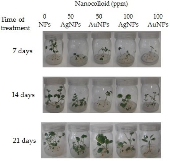 Controlling and sterile plant growth conditions in vitro facilitate an observation of the plant response to the presence of NPs in the environment. Studies are carried out to determine the effect of nanoparticles on seed germination, plant growth, genetic plant modifications and production of secondary metabolites [7,23,24,25]. AgNPs applied as a component of the Murashige and Skoog Basal Medium (MS) [26] are noted to stimulate shoot regeneration and growth [24,27], callus induction and proliferation [27] and embryogenesis [28], whereas AuNPs enhance the number of leaves, leaf area, plant height, chlorophyll content and the sugar content, thus leading to the better crop yield [22,29,30]. AuNPs increase the seed germination and seedling growth, vegetative growth, free radical-scavenging activity [31], embryogenesis and callus proliferation [28].