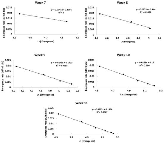 Weed seedling emergence is characterized by an initial exponential growth that is followed by a negative acceleration phase until it reaches a zero-emergence rate and no more seedlings are counted. Due to this negative acceleration phase, the derivative of the emergence decreases every week until it reaches zero. The iterative procedure that we have described above can be stopped (and recording emergence in the field can be ceased) when the derivative decreases below a certain value or threshold that should correspond with a date in which any further weed seedling emergence will not significantly affect the yield of the crop. This threshold value, which represents a percentage of the total final emergence expected, must be set according to the economics of the weed-crop competition, the usual environmental conditions, and the weed and crop species involved. This knowledge must come from the literature (see review in Swanton et al. [32]) or the farmer or adviser’s knowledge of the crop-weed interaction. Ultimately, the procedure (and the counting) can be stopped when the observed emergence reaches the predicted final emergence.