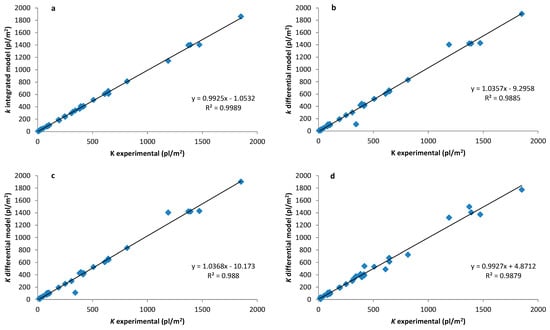 Relationships between the maximum weed seedling population observed in the field (K experimental) and the predicted weed seedling population according to different approaches: (a) the integrated approach (n = 39); (b) the differential approach with filters applied to the emergence and the derivative of the emergence and criteria to cease counts being derivative <0.03 (n = 35); (c) the differential approach with filters applied to the emergence and derivative of the emergence and criteria to cease counts being derivative <0.05 (n = 33) and (d) the differential approach with the filter applied to the derivative of emergence and criteria to cease counts being derivative <0.05 (n = 35).