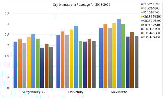 The dry biomass of the Kamyshinsky 73 cultivar that was obtained was in the range of 1.89 t ha−1 for the interaction of the disc ploughing treatment with a seeding rate of 200 thousand seeds ha−1 to 2.52 t ha−1 for the interaction of the chisel ploughing option with a seeding rate of 400 thousand seeds ha−1. A dry biomass ranging from 2.17 to 2.91 t ha−1 was obtained for the Zavolzhsky cultivar using the disc ploughing treatment with a seeding rate of 200 thousand seeds ha−1 and using the chisel processing treatment with a seeding rate of 400 thousand seeds ha−1, respectively; it was 0.28–0.39 t ha−1 higher than that of the Kamyshinsky 73 cultivar. In the Alexandrite cultivar, a dry biomass ranging from 2.41 t ha−1 for the disc ploughing option with a sowing rate of 200 thousand seeds ha−1 to 3.24 t ha−1 for the chisel ploughing treatment with a sowing rate of 400 thousand seeds ha−1 was obtained, which was a 0.24–0.35 and 0.52–0.72 t ha−1 higher dry biomass than those in the Zavolzhsky and Kamyshinsky 73 cultivars, respectively (Figure 1).