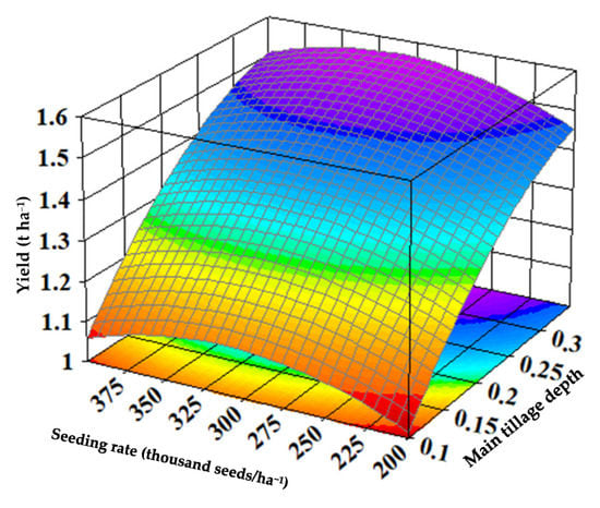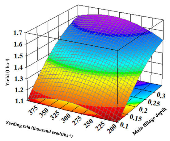 The coefficient of dependence determination was 0.90, thus indicating a good convergence of the distribution of experimental data and the response surface. Figure 3 shows that the optimal level of the sowing rate corresponded to 300 thousand seeds ha−1. This pattern was particular for the studied cultivars and did not depend on the accepted method of basic tillage.