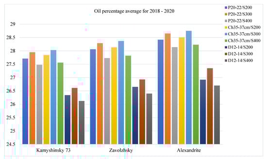 Interactive effect of different tillage techniques and seeding rates on average oil content. Abbreviations: P20–22/S200 represents moldboard plow PN-4-35 with depth of 20–22 cm/seeding rate of 200; P20–22/S300 represents moldboard plow PN-4-35 with depth of 20–22 cm/seeding rate of 300; P20–22/S400 represents moldboard plow PN-4-35 with depth of 20–22 cm/seeding rate of 400; Ch35–37 cm/S200 represents chisel plow OCHO 5-40 with depth of 35–37 cm/seeding rate of 200; Ch35–37 cm/S300 represents chisel plow OCHO 5-40 with depth of 35–37 cm/seeding rate of 300; Ch35–37 cm/S400 represents chisel plow OCHO 5-40 with depth of 35–37 cm/seeding rate of 400; D12–14/S200 represents disc plow BDM-4 with depth of 12–14 cm/seeding rate of 200; D12–14/S300 represents disc plow BDM-4 with depth of 12–14 cm/seeding rate of 300; and D12–14/S400 represents disc plow BDM-4 with depth of 12–14 cm/seeding rate of 400.