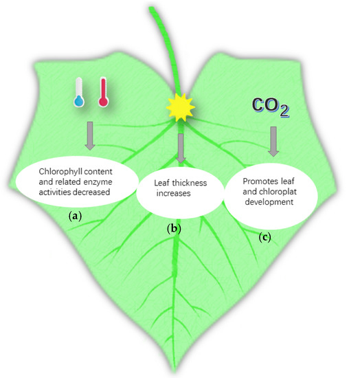 Environmental factors affecting leaf development as follows: (a) effect of temperature (blue, low temperature; red, high temperature); (b) effect of light—with the increase in leaf thickness, the thickness of palisade tissue and sponge tissue increased, the number of stomata increased, and the content of chlorophyll also increased; (c) influence of CO2—after CO2 enrichment, the thickness of the palisade tissue, epidermis, and cucumber leaves increased, and the number and size of chloroplasts, starch grains, grana, and their lamellae increased.
