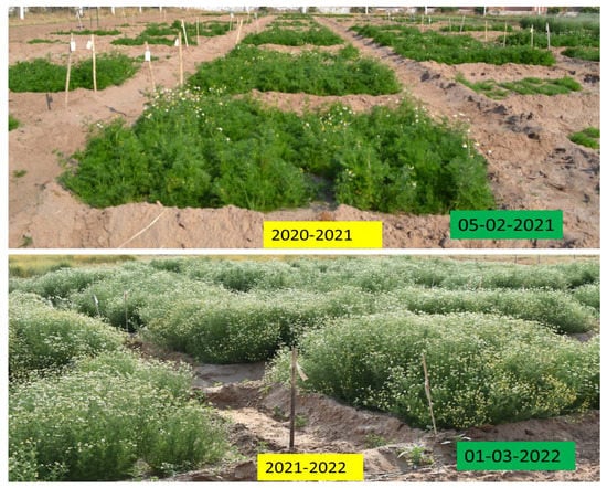 The discovery of formulated drugs and their greater availability to people are of benefit in the speedy control of illnesses, but medicinal plants are still widely used due to their economic viability and historical importance. According to the WHO [], 70% to 95% of developing-country populations use medicinal herbs for primary care. Many herbal medicines are perceived as being green and healthy, having few side effects, and being simple to obtain; additionally, they generate income. As a result, interest in using natural ingredients rather than synthetic chemicals has increased. The uncontrolled harvesting of natural populations and the growth of urban areas are both factors that pose a threat to the diversity of medicinal plants. The cultivation of these species can decrease the stress imposed on their wild populations and, as a result, save them from extinction []. Since the cultivation of medicinal plants allows for more precise control over the quality of the targeted bioactive components, this is recommended []. This strategy also enables the creation of consistent plant material at regular intervals in the requisite quantities, which can then be harvested as needed. Chamomile (Matricaria chamomilla L.) is a common medicinal plant that has a growing demand globally []. To meet the increased demand for chamomile, it is important to increase flower yield, expand cultivation zones, and improve quality.