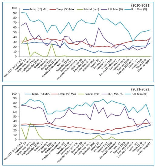 Weekly meteorological parameters during the Rabi seasons of 2020–2021 and 2021–2022.
