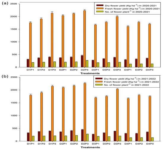 Effect of spacing of plants and date of sowing on the yield of chamomile (Matricaria chamomilla L.) during 2020–2021 (a) and 2021–2022 (b).