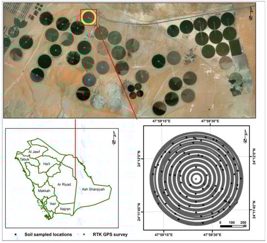 The experimental work was conducted on a 50 ha field (ID: Pivot-2) located in the Tawdeehiya Farms, 200 km southeast of Riyadh, the capital of Saudi Arabia. This farm, which covers an area of about 7000 ha, is located in an arid climatic zone between the latitudes of 24°10′22.77″ and 24°12′37.25″ N and longitudes of 47°56′14.60″ and 48°05′08.56″ E (Figure 1). The soil in the farm is mainly sandy loam and the major cultivated crops were alfalfa, Rhodes grass, corn and carrot. The annual mean minimum and maximum temperatures of the experimental site were 12 °C (winter) and 42 °C (summer), respectively. The mean annual rainfall was ~98 mm, mainly distributed between November and February []. The crop history of the experimental field (ID: Pivot-2) for the period from January 2015 to October 2017, provided by the farm manager, indicated that the field was under-cultivated for alfalfa crop for the period from March 2015 to November 2016, followed by Rhodes grass for the period from November 2016 up to October 2017.